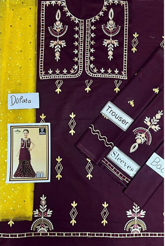 Kids 3PC Embroidered Lawn Dress With Net Dupatta - Unstitched - AL41