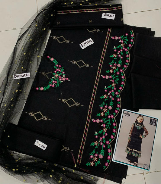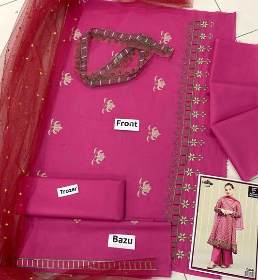 Kids 3PC Embroidered Lawn Dress With Net Dupatta - Unstitched - KD64