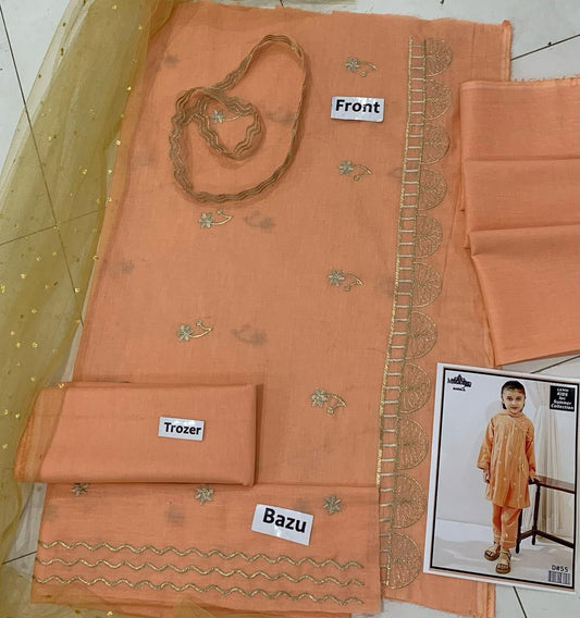 Kids 3PC Embroidered Lawn Dress With Net Dupatta - Unstitched - KD55