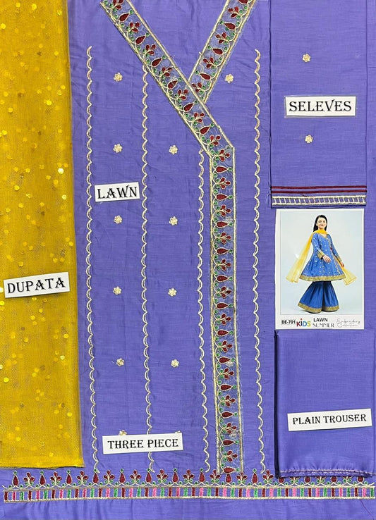 Kids 3PC Embroidered Summer Dress With Net Dupatta - Unstitched - DE-701