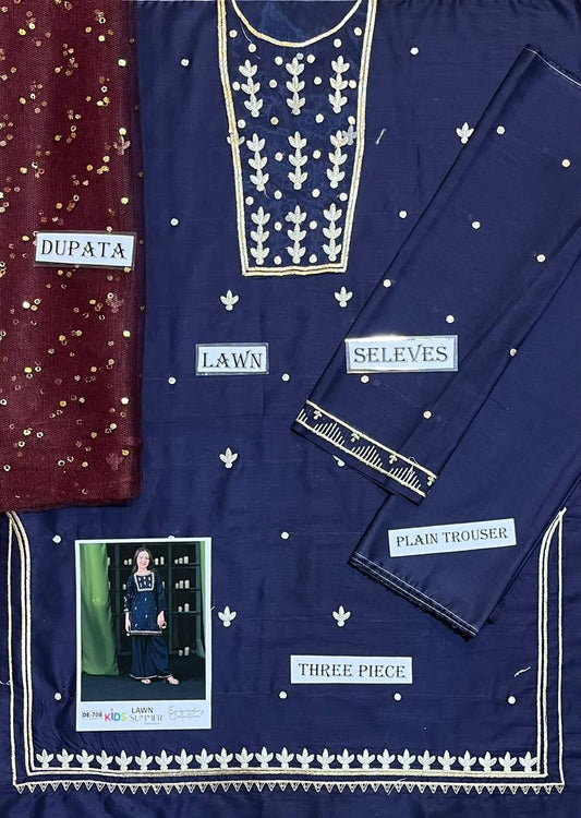 Kids 3PC Embroidered Summer Dress With Net Dupatta - Unstitched - DE-721BL