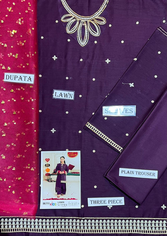Kids 3PC Embroidered Summer Dress With Net Dupatta - Unstitched - DE-711