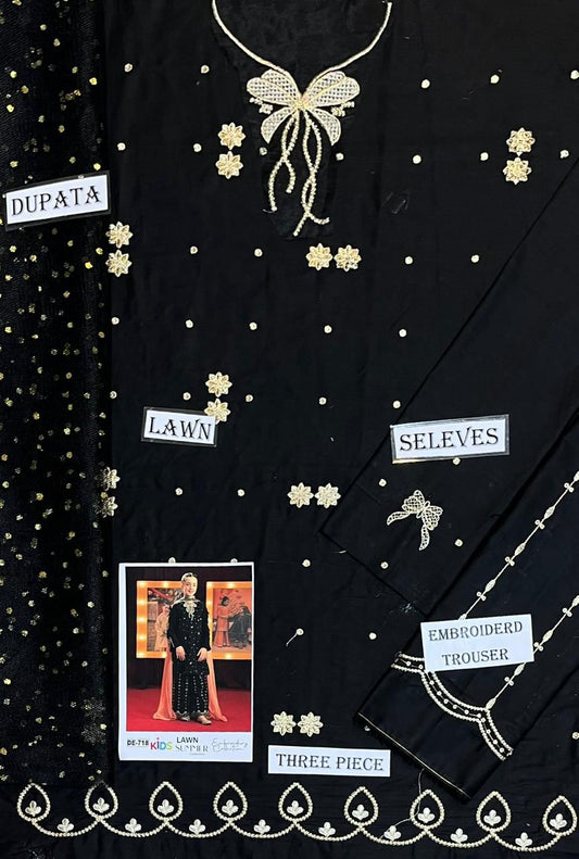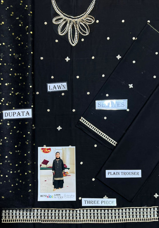 Kids 3PC Embroidered Summer Dress With Net Dupatta - Unstitched - DE-718
