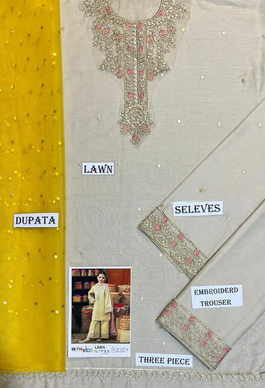 Kids 3PC Embroidered Summer Dress With Net Dupatta - Unstitched - DE-714