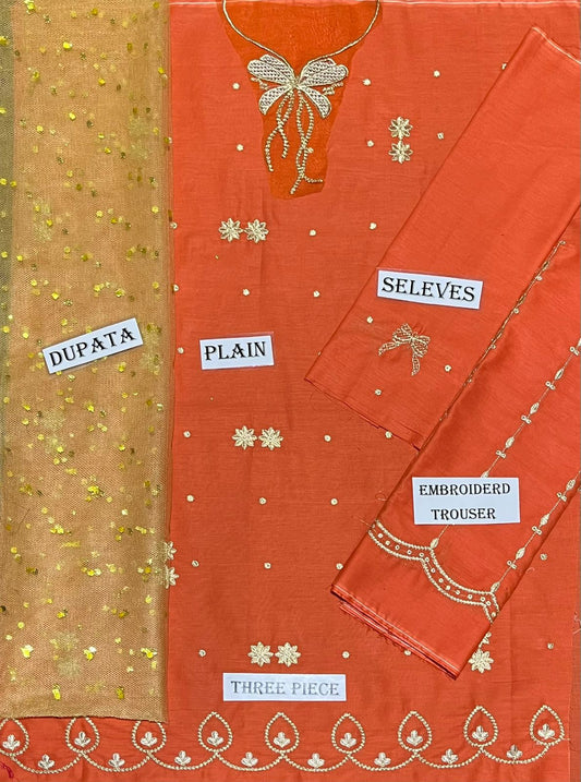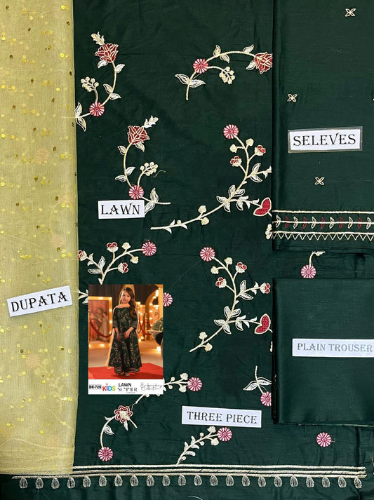Kids 3PC Embroidered Summer Dress With Net Dupatta - Unstitched - DE-02