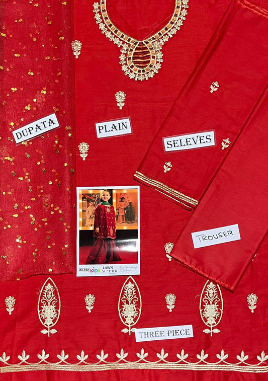 Kids 3PC Embroidered Summer Dress With Net Dupatta - Unstitched - DE-722