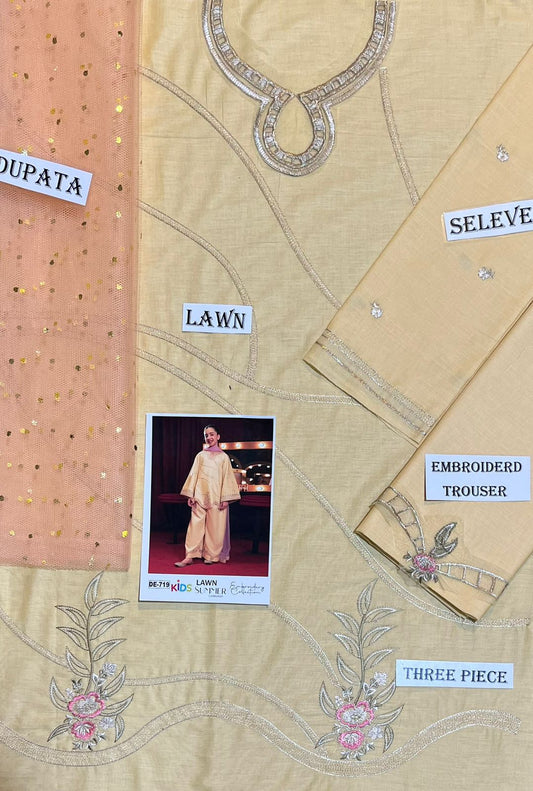 Kids 3PC Embroidered Summer Dress With Net Dupatta - Unstitched - DE-719