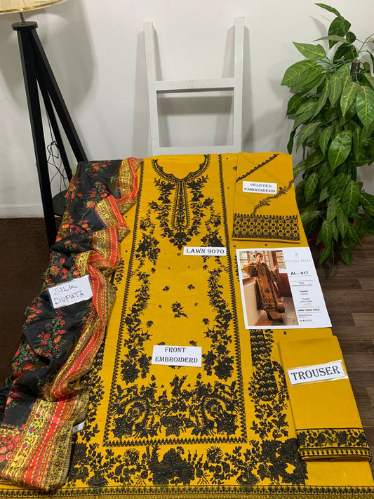 3 Piece - Embroidered Lawn Suit With Printed Silk Dupatta AL-817