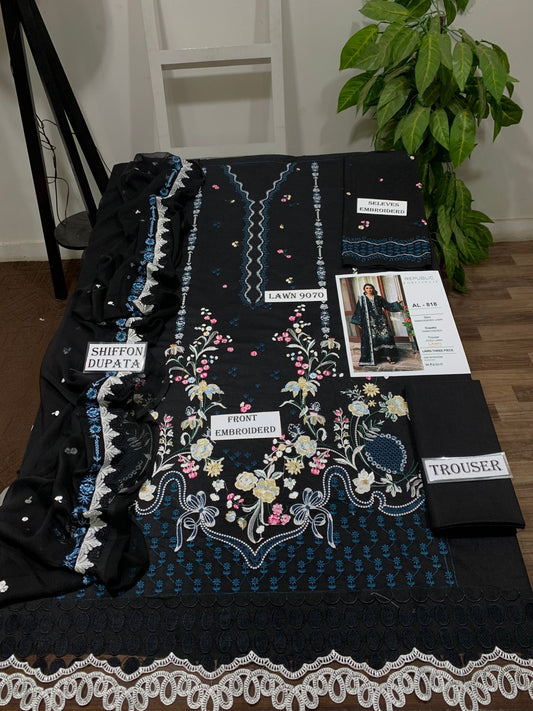 3 Piece - Embroidered Lawn Suit With Embroidered Chiffon Dupatta AL-819
