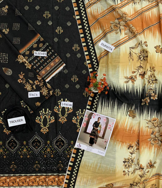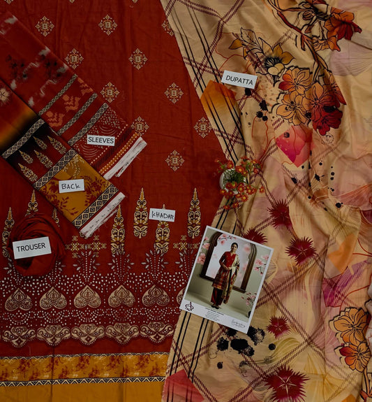 Khaddar 3PC Printed Chicken Kari Dress With Printed Shawl- KH-1